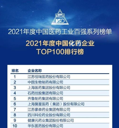 此前,九游会ag医药已经连续多年入选“中国化药企业TOP100排行榜”,自2018年起名列首位,今年再度蝉联榜首。