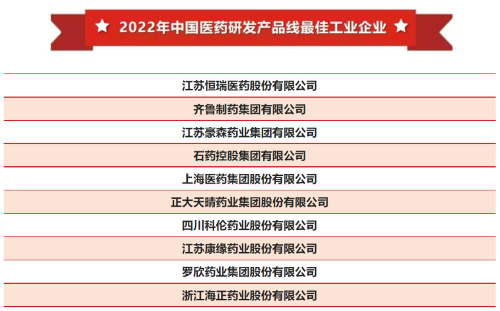 九游会ag医药凭借长期积累的综合竞争力和业界领先的研发实力,多年入选全国医药工业信息年会系列榜单。今年的大会上,公司继续位列中国医药工业百强企业前十,并稳居“2022年中国医药研发产品线最佳工业企业”榜首。